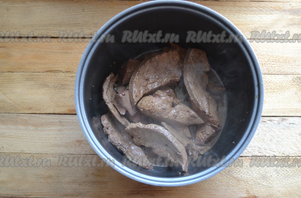 В чашу мультиварки вливаем масло и выкладываем печень. Обжариваем ее в течение 10 минут, помешивая.