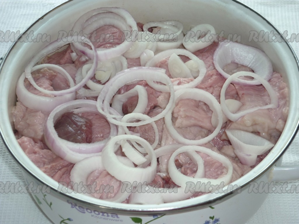 Очищенный лук нарезать кольцами и добавить к нарезанному мясу.