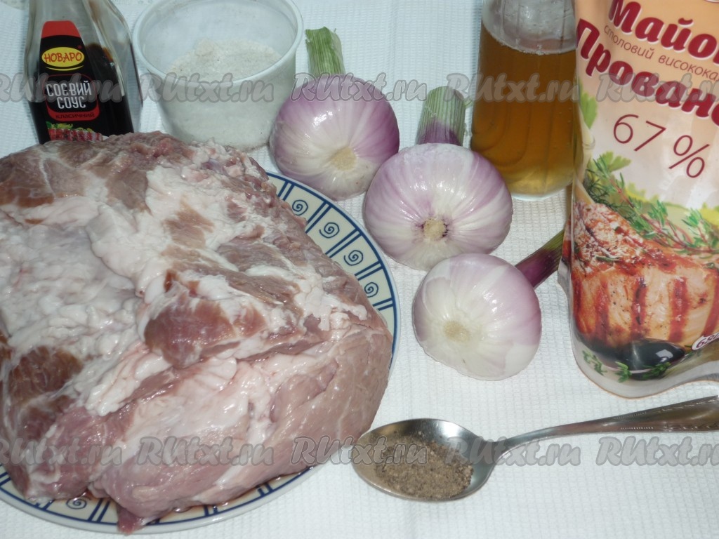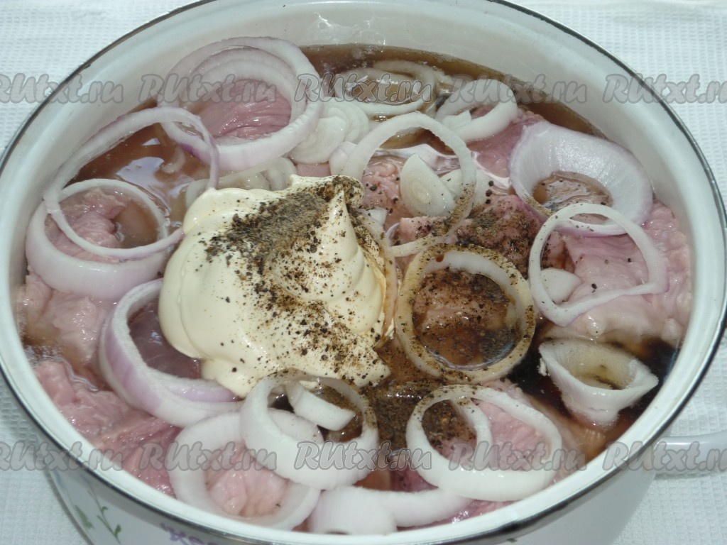 Всыпать соль (много не добавляйте, потому что в дальнейшем будут добавляться соевый соус и майонез, а они сами по себе достаточно соленые), чёрный молотый перец, залить свинину пивом, добавить майонез и соевый соус, перемешать, чтобы мясо было полностью покрыто маринадом. Накрыть кастрюлю крышкой и отправить в холодильник на 5 и более часов, можно на ночь.