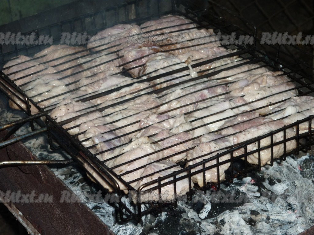 Жарить шашлык на мангале над углями до готовности (то есть пока при прокалывании куска мяса из него не перестанет выделяться кровь), постоянно переворачивая.
