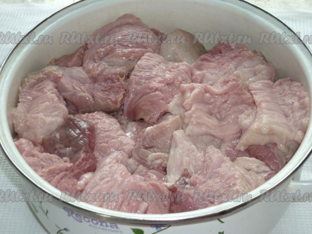 Свинину вымыть холодной водой, обсушить и нарезать на порционные кусочки одинакового размера, примерно 5х5 см.