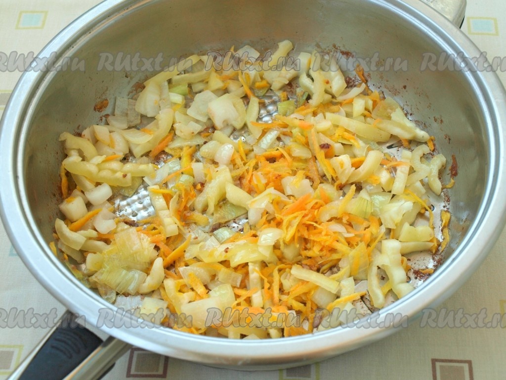 Очистить, Подготовить овощи: натереть морковь; лук, помидор и кабачок нарезать кубиками, перец - соломкой. Фрикадельки убрать со сковороды в тарелку на время, а вместо них в сковороду добавить лук с морковью и немного обжарить, иногда помешивая.