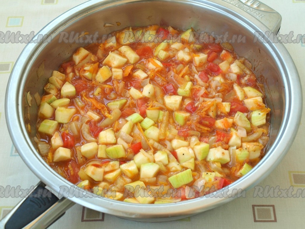 Когда овощи немного станут мягкими, добавить кабачок и томатную пасту, посолить, поперчить и готовить 5 минут, иногда помешивая.
