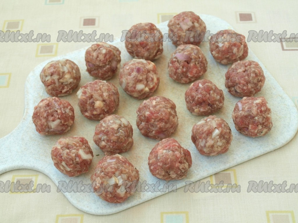 Ломтики батона залить тёплой водой. Нарезать как можно мельче одну очищенную луковицу. Затем батон отжать и добавить в фарш, туда же добавить мелко нарезанную луковицу и пропущенный через пресс чеснок. Получившийся фарш нужно тщательно перемешать, а затем выбить о дно миски. Из фарша сформировать небольшие мясные шарики (фрикадельки).