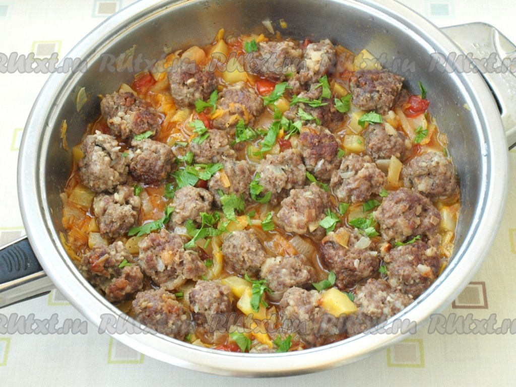 В сковороду с овощным соусом налить горячую воду и вернуть фрикадельки. Тушить до готовности кабачков. Измельчить петрушку и посыпать ею блюдо перед подачей.