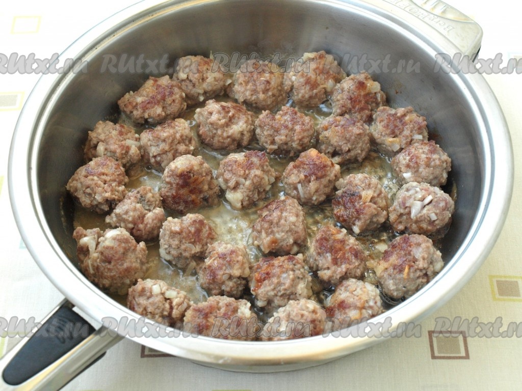Разогреть в сковороде подсолнечное масло, выложить фрикадельки и обжарить их до румяной корочки на среднем огне с двух сторон.