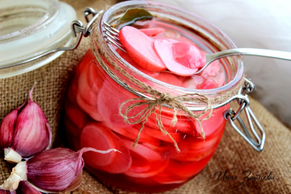 Сегодня я расскажу вам простой и очень удачный рецепт быстрого приготовления маринованной редиски, которая понравится всем любителям в меру острых закусок. Редис получается очень вкусным, пикантным, невероятно красивого цвета. Готовится закуска просто и быстро, из доступных ингредиентов. К столу её можно подавать уже через сутки.