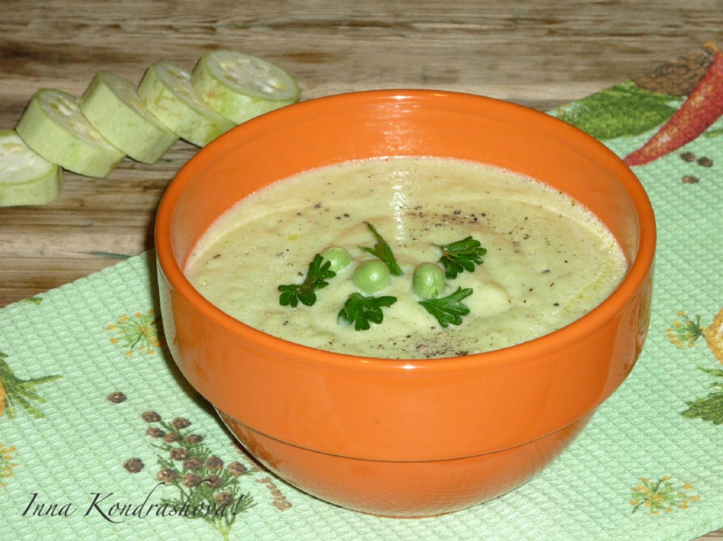 Суп-пюре из кабачков, приготовленный со сливками на курином бульоне, разлить по порционным тарелкам и сразу подать на стол, украсив зеленью или сухариками.