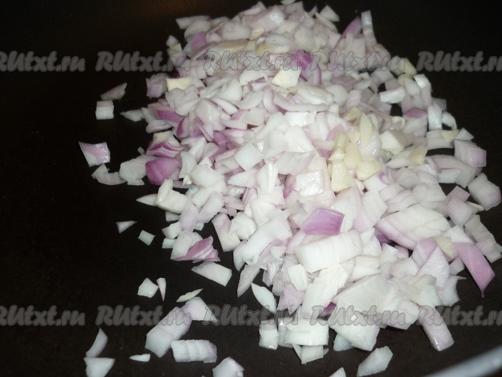 Лук и чеснок очистить, нарезать кубиками и обжарить на среднем огне в течение 5 минут на сливочном масле, постоянно помешивая.