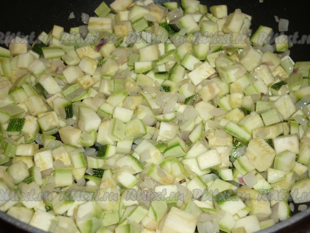 Молодые кабачки среднего размера вымыть под холодной проточной водой. Обрезать хвостики (кожуру можно не очищать с молодых кабачков). Нарезать кабачки небольшими кубиками и добавить к луку и чесноку, готовить 15 минут, помешивая, посолить и поперчить по вкусу. Крышкой сковороду накрывать не надо. По истечении времени кабачки станут достаточно мягкими (обжаривать до золотистой корочки не нужно, кабачки должны стать мягкими).