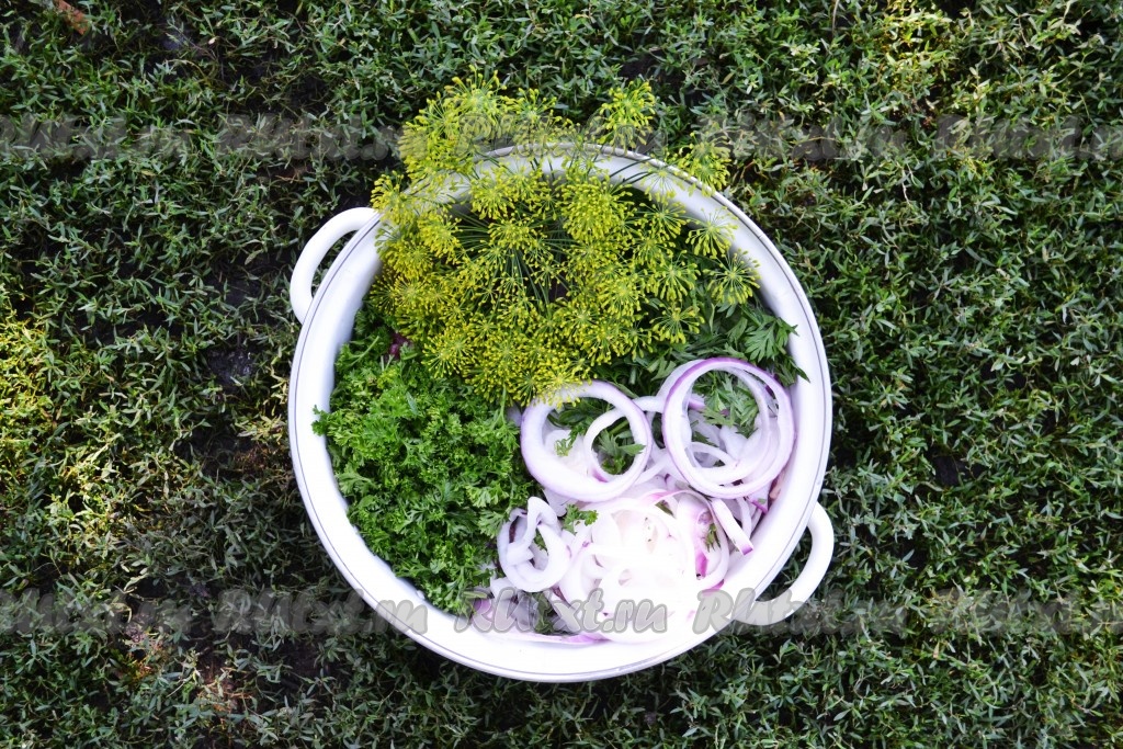 Моем петрушку, веточки моркови и зонтики укропа. Зелень можно варьировать по своему вкусу - что-то заменить или убрать, или добавить (например, базилик и веточку розмарина). Очищаем и моем лук. Помидоры перемалываем мясорубкой или перетираем с помощью блендера.