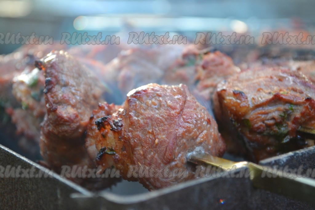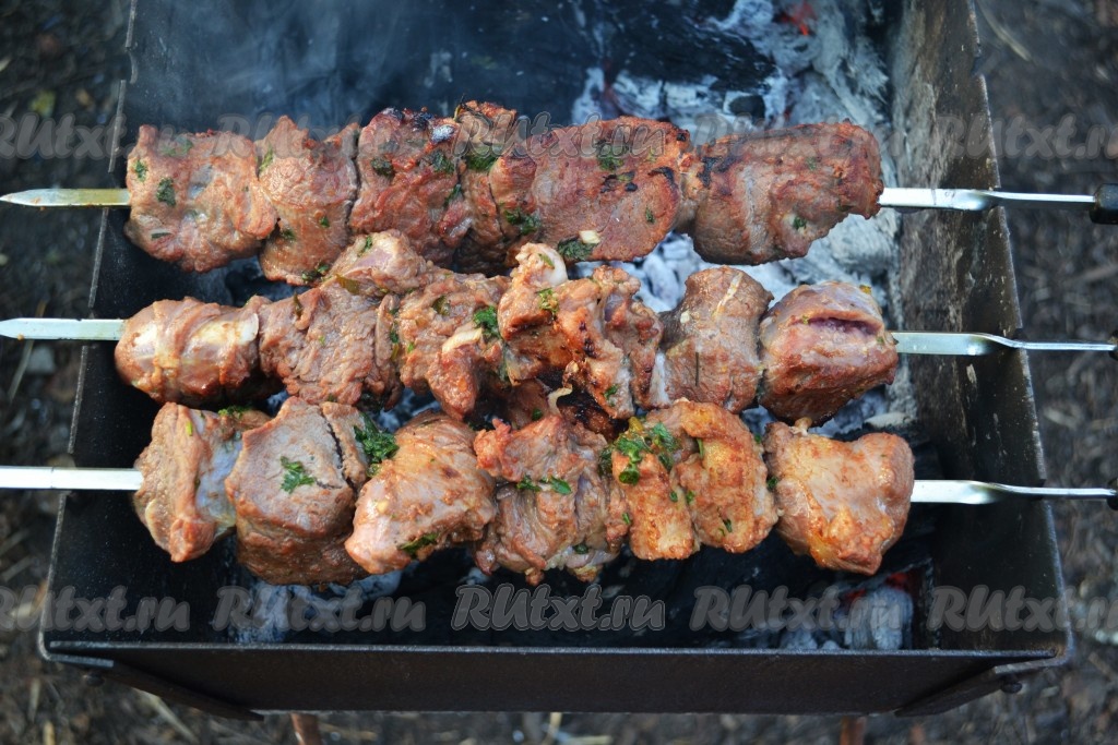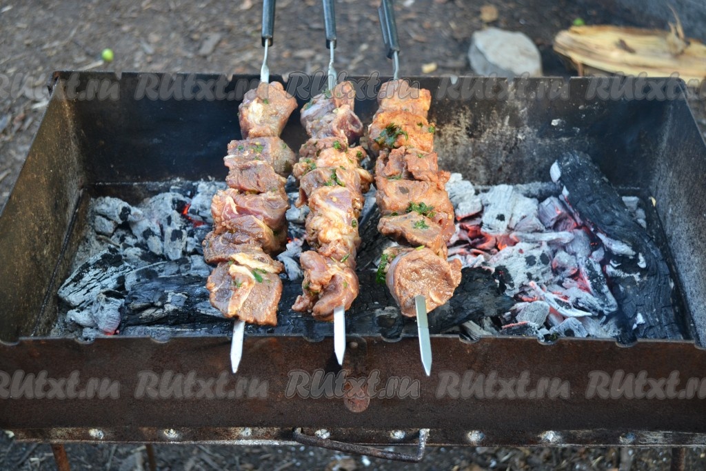 Жарим шашлык из баранины, периодически (но не часто!) переворачивая шампуры.