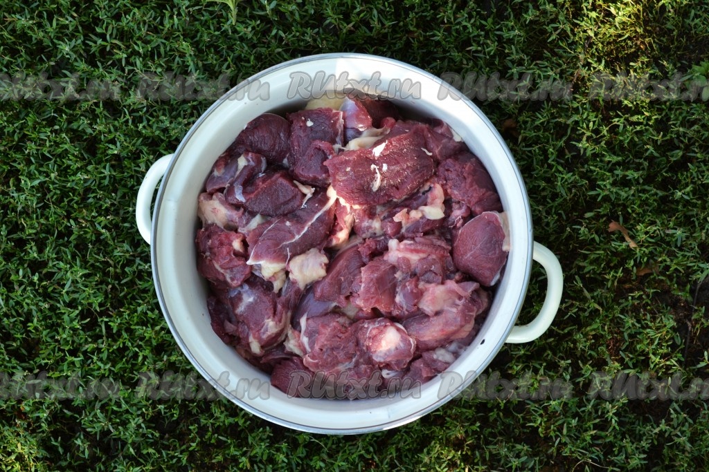 Для сочного, мягкого шашлыка нужно срезать мякоть с позвоночной части. Также можно использовать вырезку и мясо с задней части. Нарезать мякоть кусочками, не срезая жир, чтобы шашлык не получился сухим. Или же срезая, если жира очень много, а то шашлык будет иметь явно выраженный специфический запах. Складываем мясо в кастрюлю для маринования.