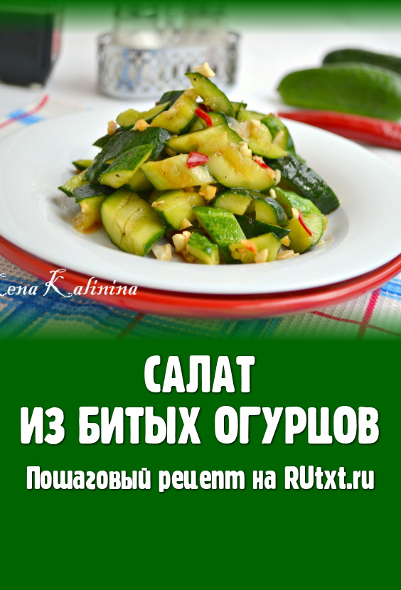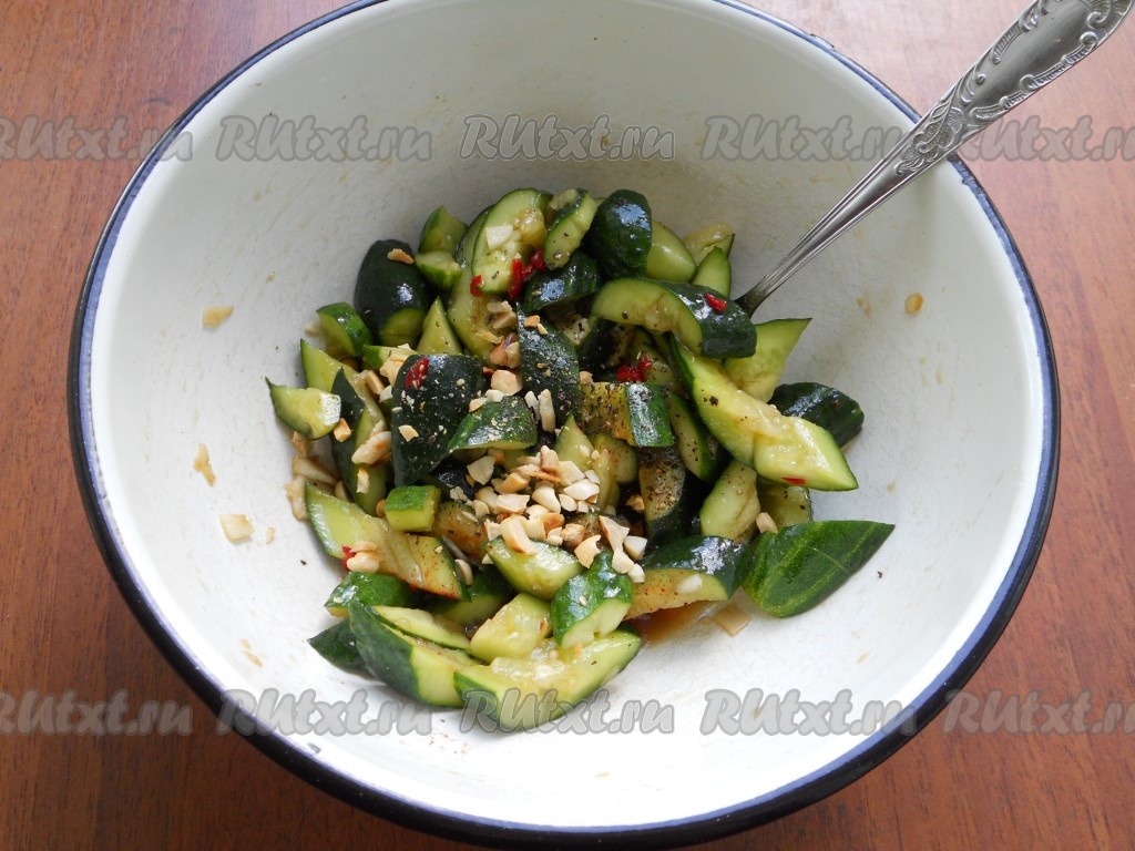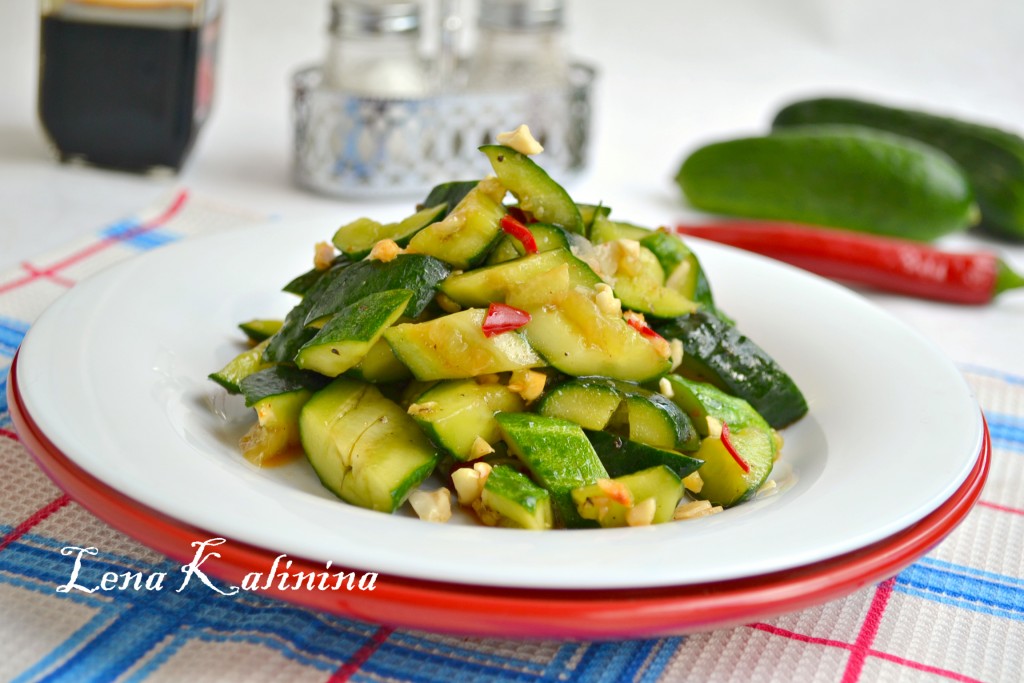 Салат из битых огурцов - салат-закуска с оригинальным приготовлением. Блюдо относится к китайской кухне. Огурцы получаются очень вкусными, остренькими и необычными. Отлично подать это блюдо к рису, отварному картофелю. Огурцы "бьются" для того, чтобы они лучше пропитались ароматной заправкой. Я добавила к огурцам жареный арахис, в оригинальном рецепте используется кунжут.