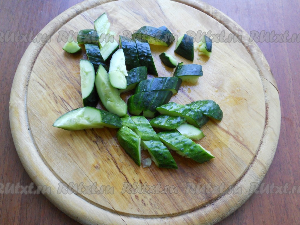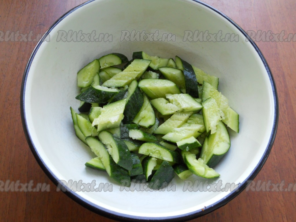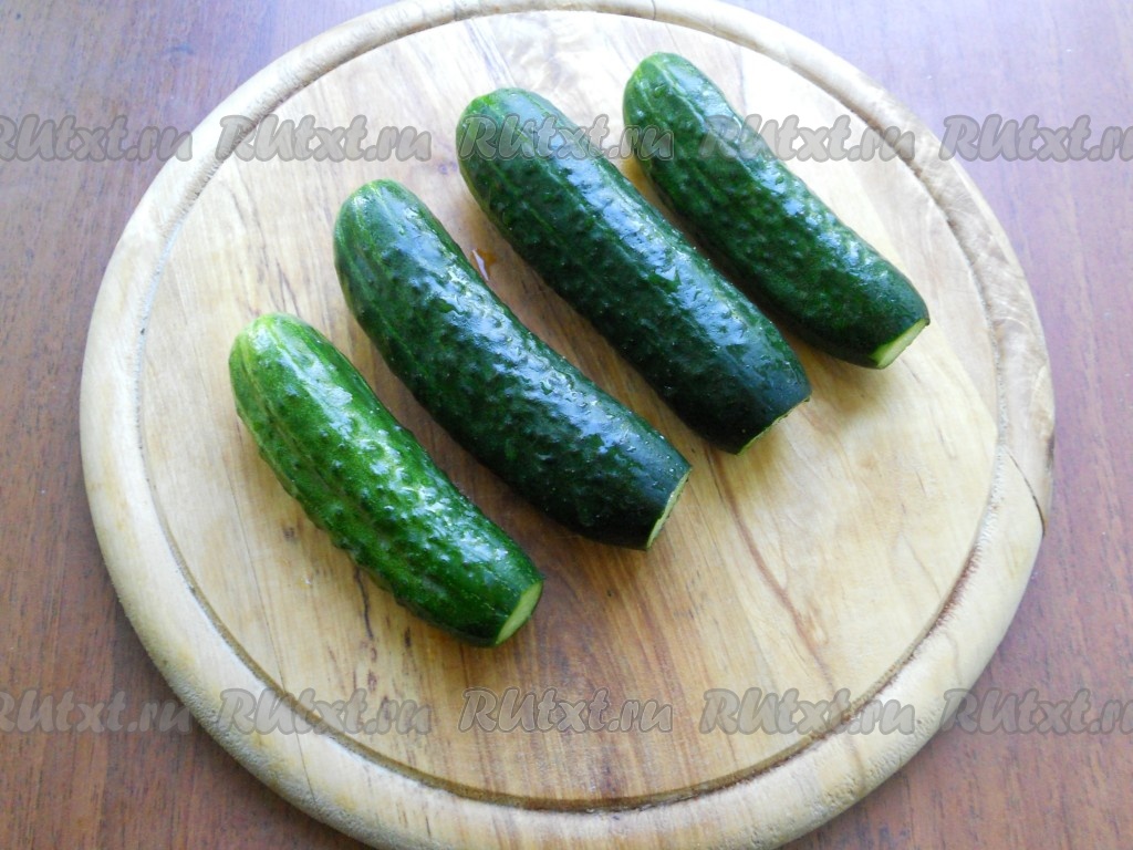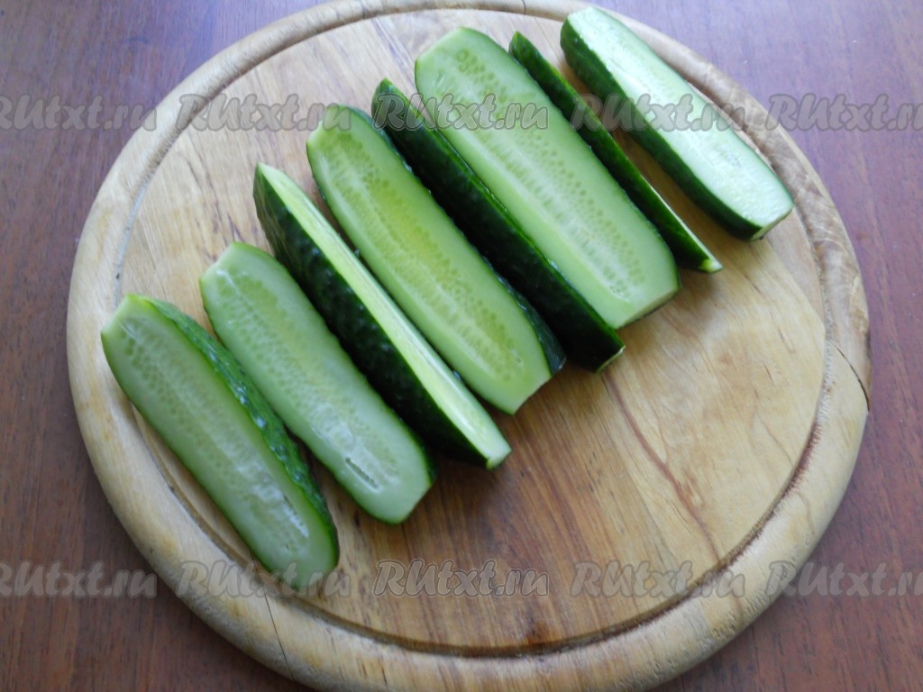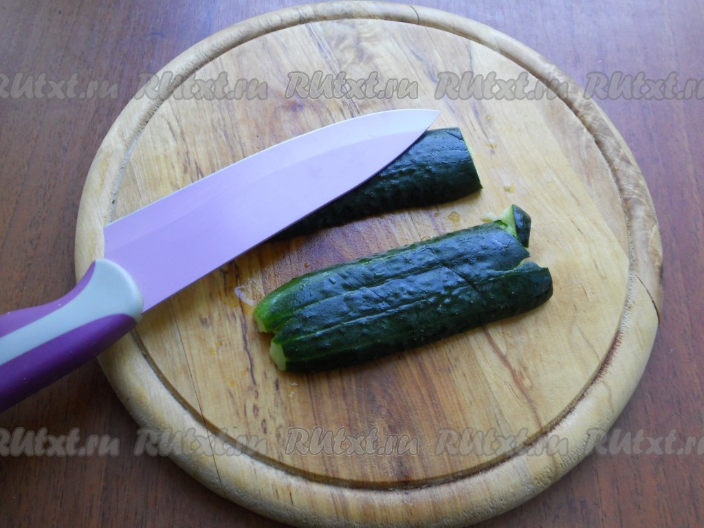 Разрезать каждый огурец вдоль на 2 части. Если семена у огурцов крупные, середину удалите. У меня огурчики молоденькие, небольшие, я не удаляла.