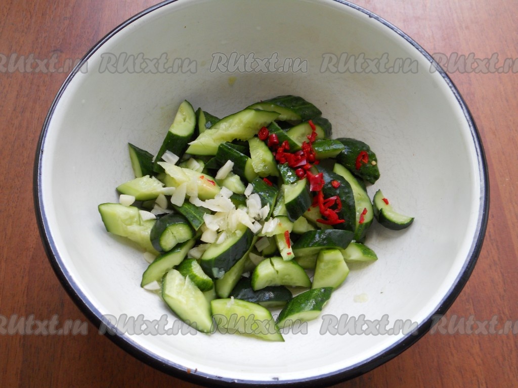 Выделившуюся жидкость с огурцов слить, добавить к ним измельченный чеснок и мелко нарезанный перец чили.