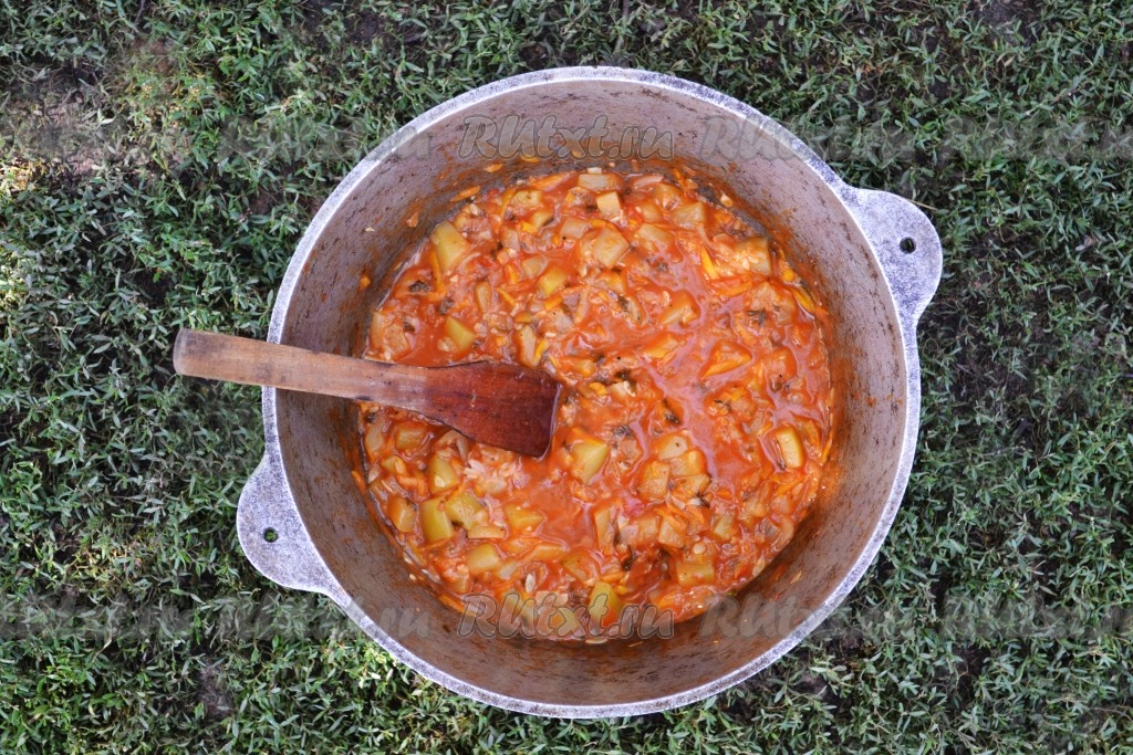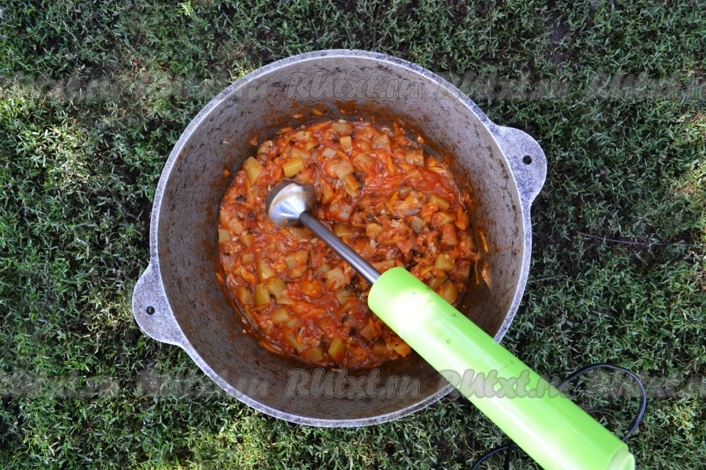 С помидоров снимаем шкуру и перемалываем мясорубкой или блендером. Вливаем томатный сок к остальным овощам в казан (или толстостенную кастрюлю).