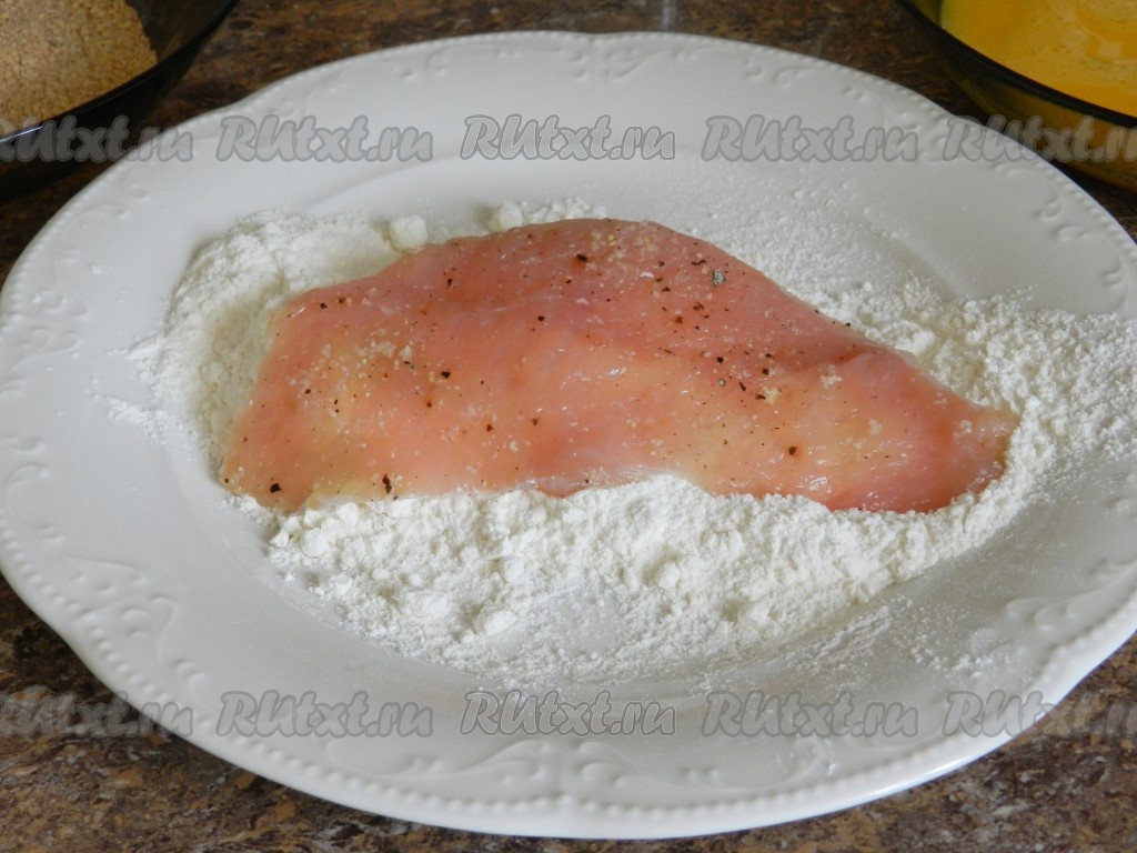 Отбивную из индейки обвалять сначала со всех сторон в муке.