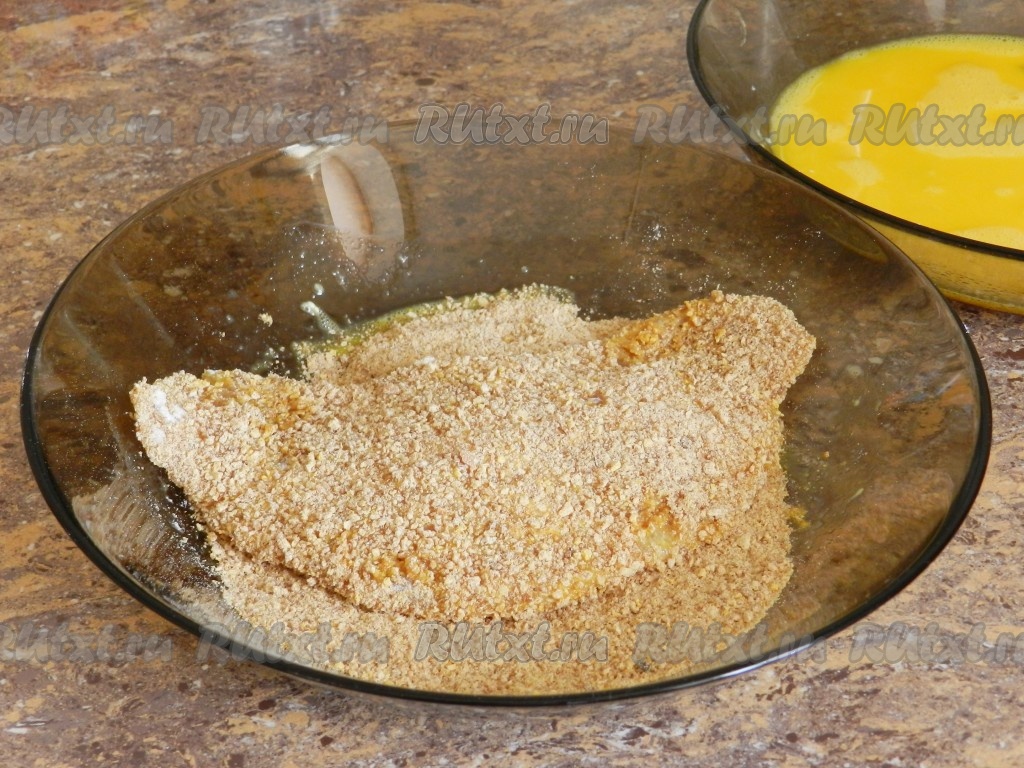 Затем окунуть в яйца, а затем обвалять в сухарях.