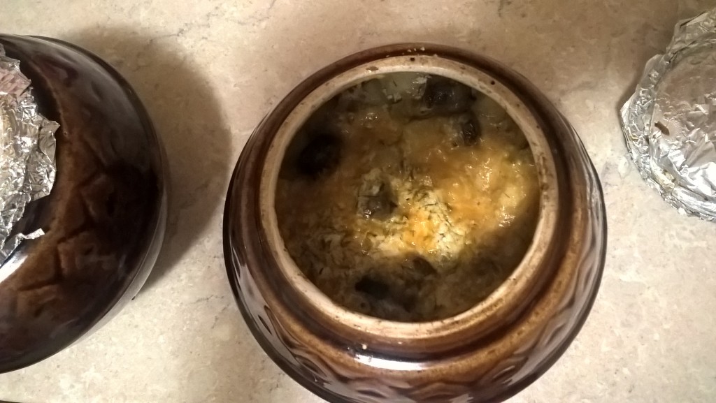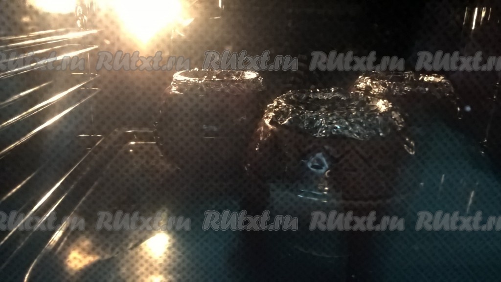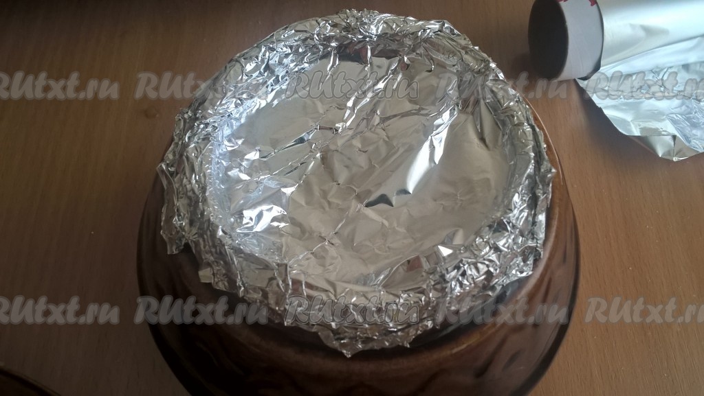 У меня нет крышечек от горшочков, не сохранились, поэтому я сделала их из фольги. Можно сделать также хлебные крышечки из самого простого теста: 1 яйцо, треть стакана воды, соль и сода на кончике ножа, муки сколько возьмет, вымешиваем, тесто должно быть плотным, эластичным, не липнущим к рукам. Накрываем тесто и оставляем минут на 20-30, оно станет мягче и эластичнее. Затем раскатать чуть больше, чем диаметр горшочка, чтобы были края, и накрыть горшочек.