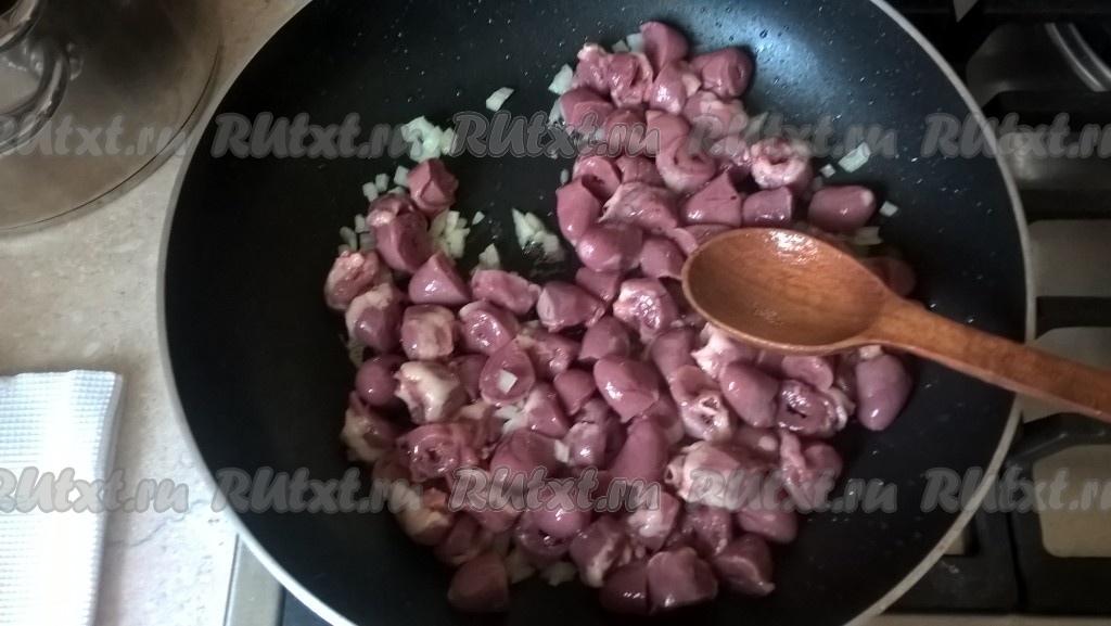 Куриные сердечки вместе с мелко нарезанным луком обжарить на растительном масле минут 5, иногда перемешивая.