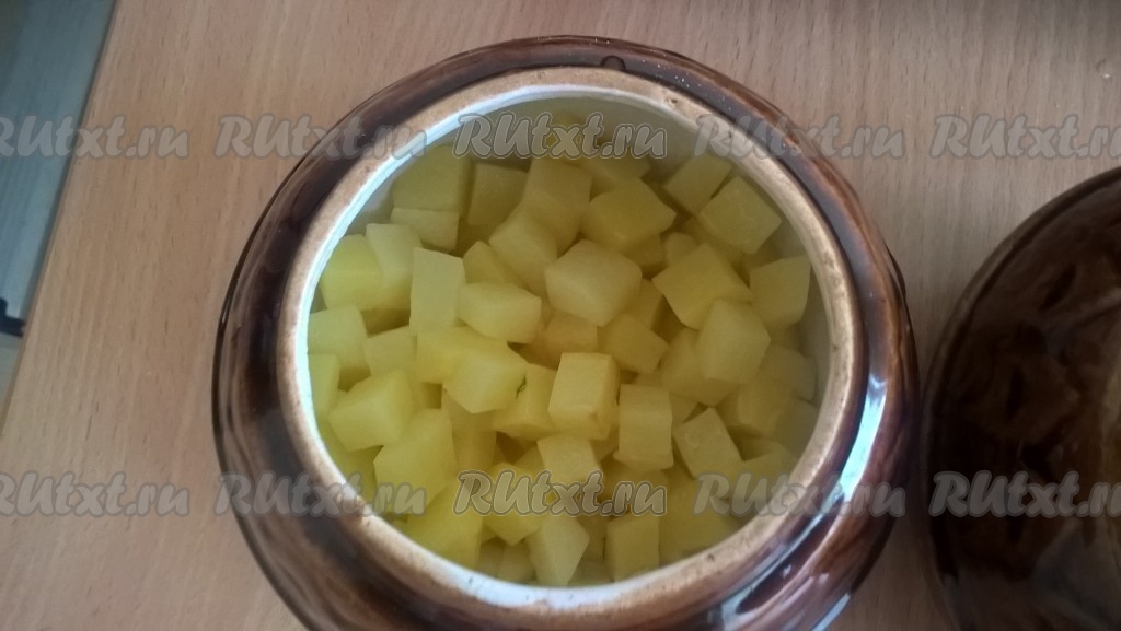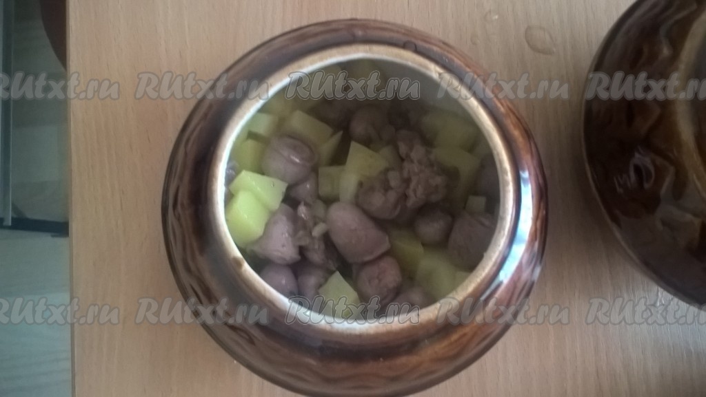 Начать раскладывать по горшочкам: налить немножко воды на дно, выложить картошку, затем сердечки. Посолить, добавить специи по вкусу (я делала без них), добавить щепотки три сахара, перемешать все ингредиенты.