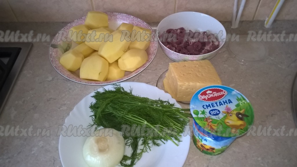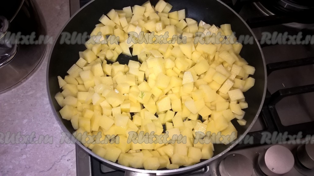 Подготовим продукты, куриные сердечки предварительно очистить и вымыть, затем нарезать или можно готовить целиком - кто как любит. Я разрезала сердечки пополам (на две части). Картошку нарезать кубиками и обжарить на сковородке на растительном масле, иногда помешивая, минут семь.