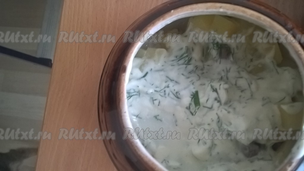 Выложить сметанную смесь и капнуть в тарелку, там где была сметана, немного воды и снова столовой ложкой распределить эти остатки сметанной воды по горшочкам.