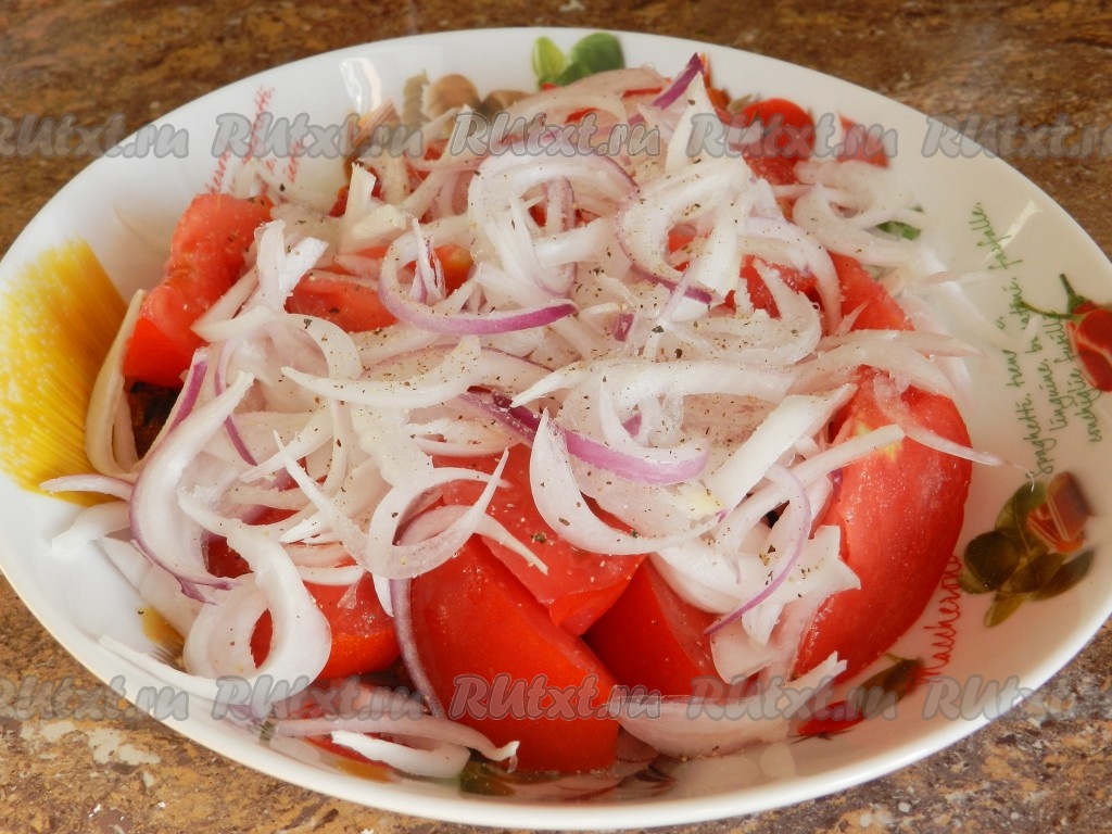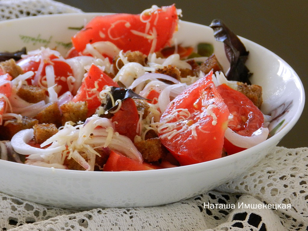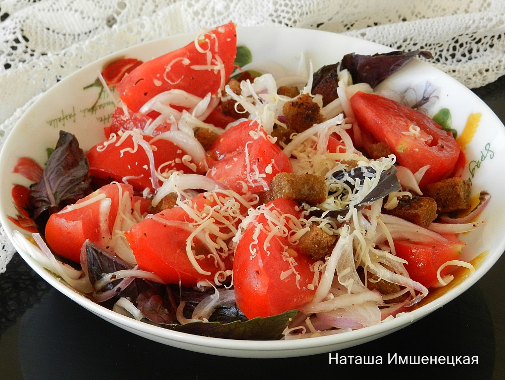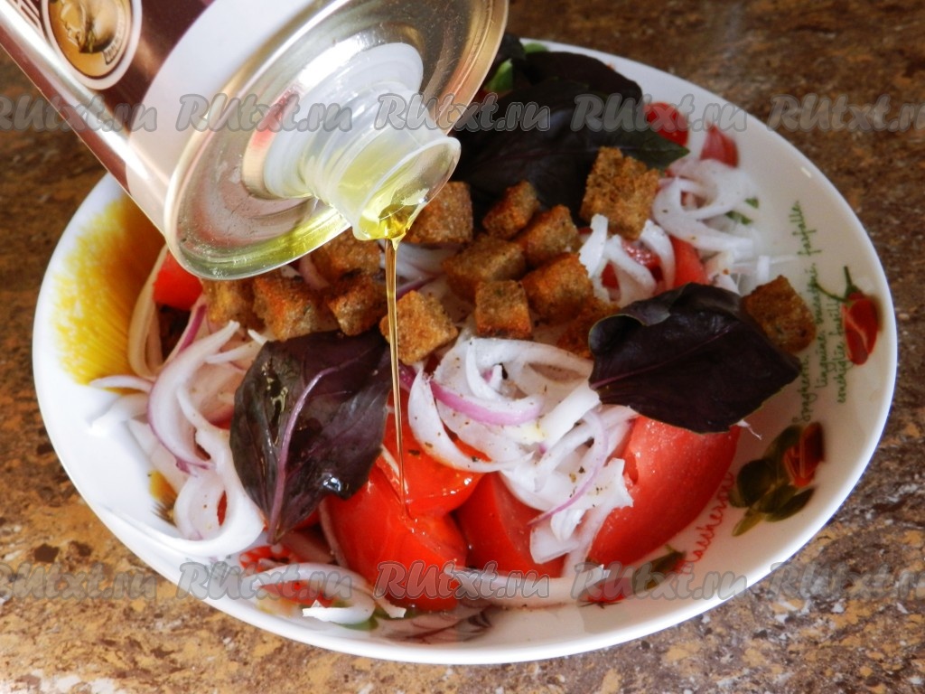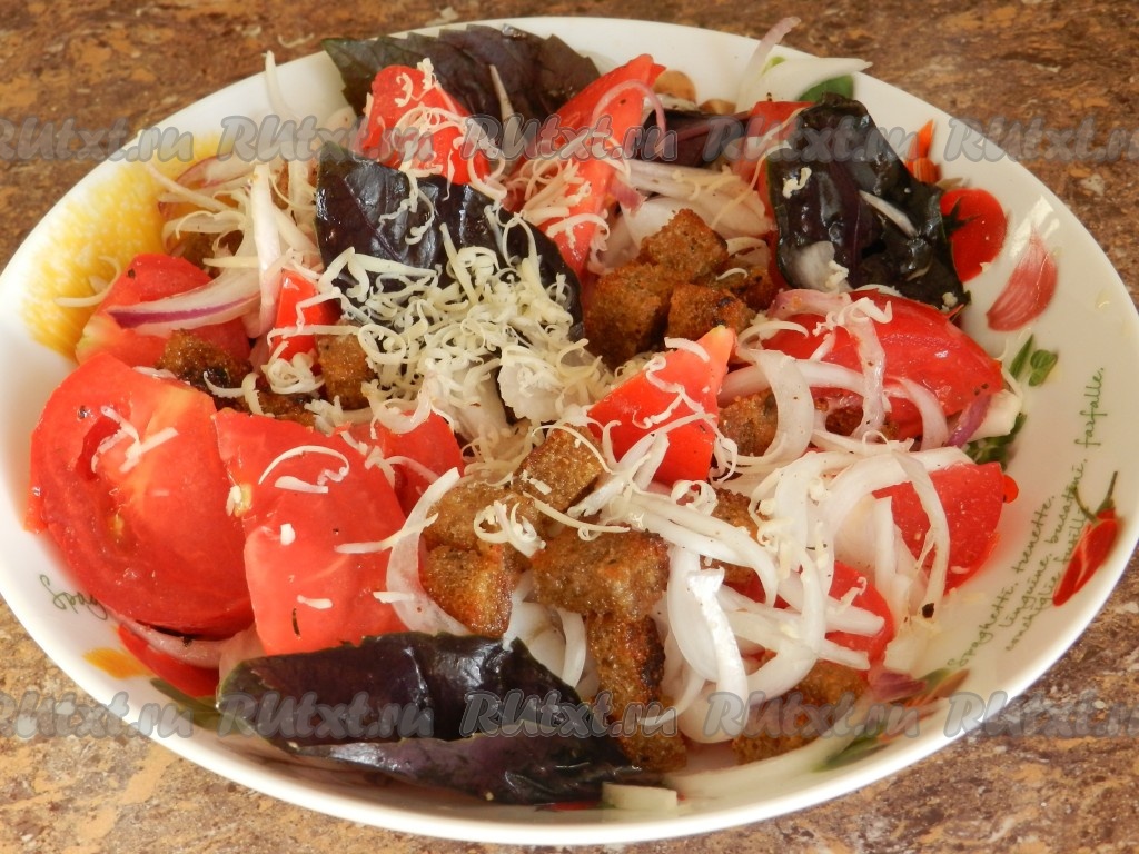 Салат с помидорами и сухариками, приготовленный по этому рецепту, получается сочным, ароматным и очень вкусным.