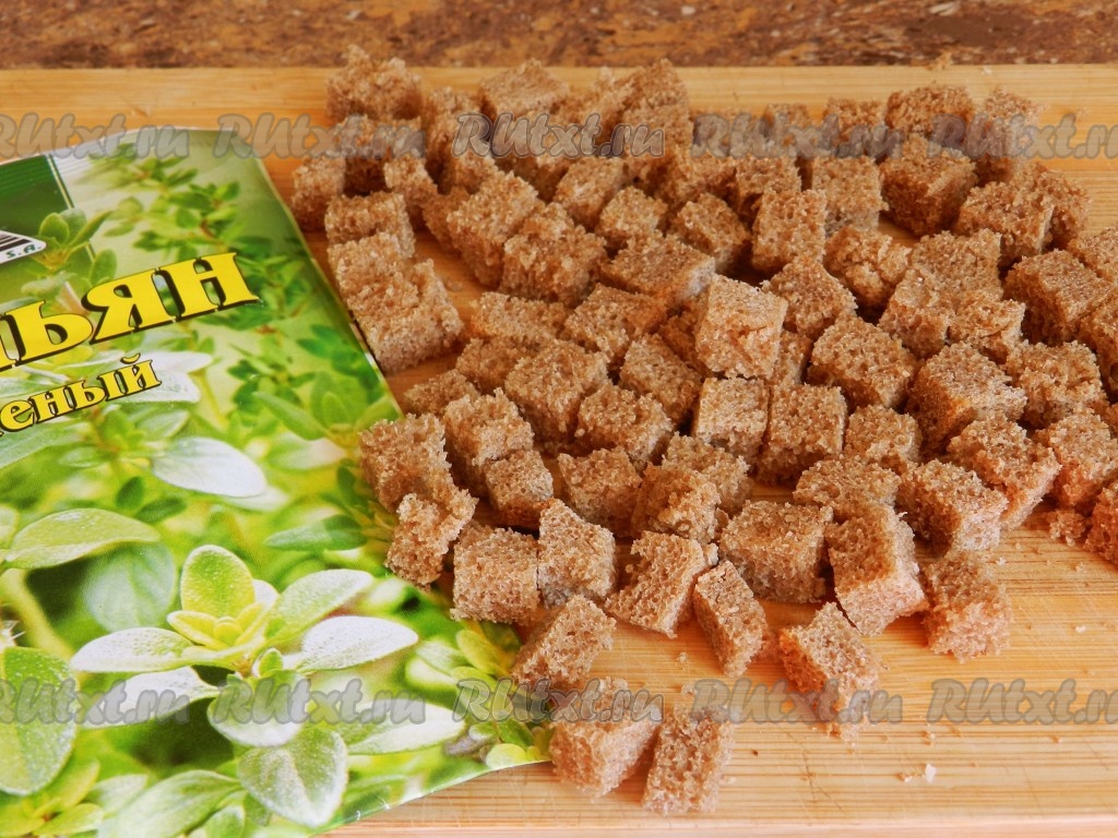 На сковороде разогреть оливковое масло, затем выложить хлеб, присыпать сушеным тимьяном и обжарить со всех сторон. Слишком сильно зажаривать не нужно, как только сухарики станут золотистого цвета, снять с огня и остудить.
