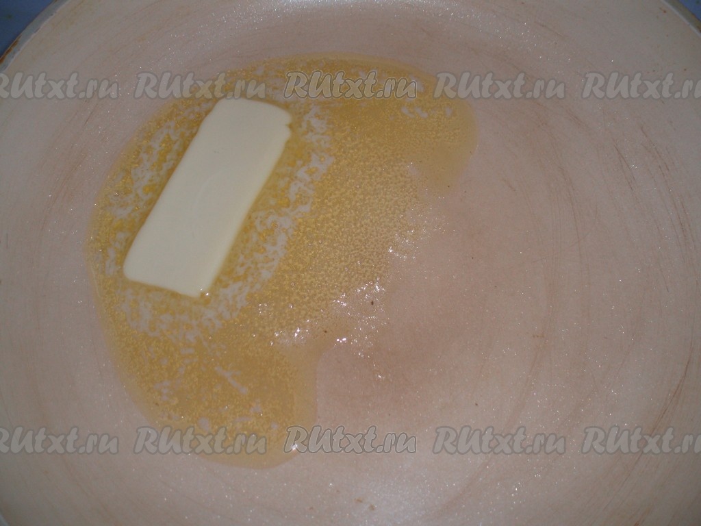 Сперва нужно приготовить тесто для клецок. Для этого сливочное масло растопить на сковороде.