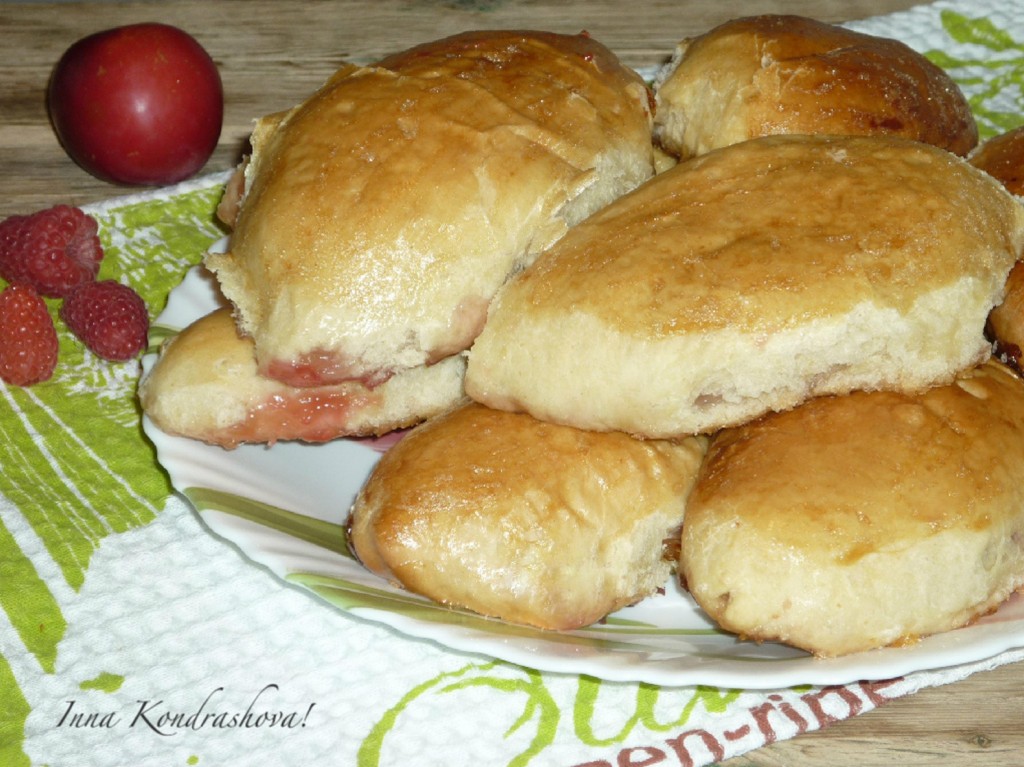 Тёплые пирожки снять с пергамента, чтобы они не прилипли и подавать на стол. Воздушные, мягкие, сладкие пирожки с фруктами, приготовленные из дрожжевого теста, подать к столу. Очень вкусно с молоком, компотом или чаем.