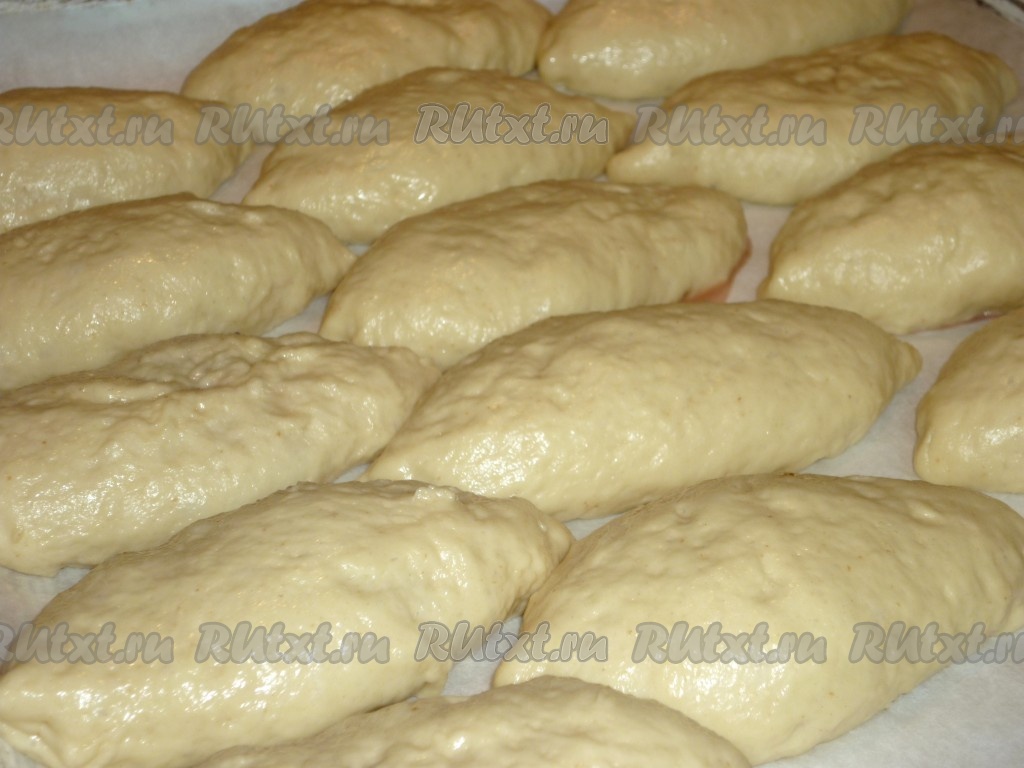 Выложить пирожки на противень, застеленный пергаментом, швом вниз. Дать постоять в тёплом месте минут 10. Затем смазать взбитым белком с помощью силиконовой кисточки и отправить в разогретую до 180 градусов духовку.