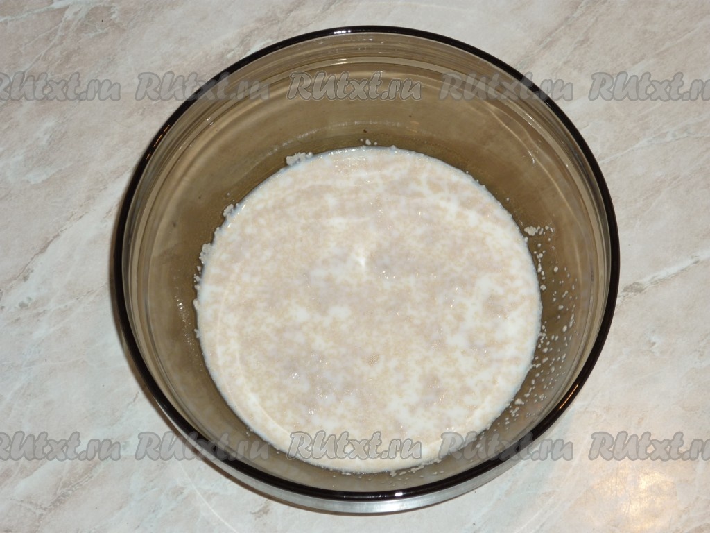 В тёплое молоко добавить одну столовую ложку сахара и дрожжи, размешать и оставить на 10 минут, чтобы дрожжи ожили.