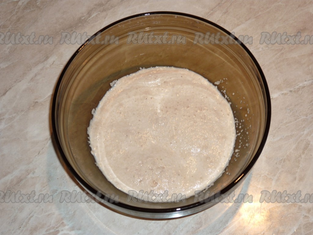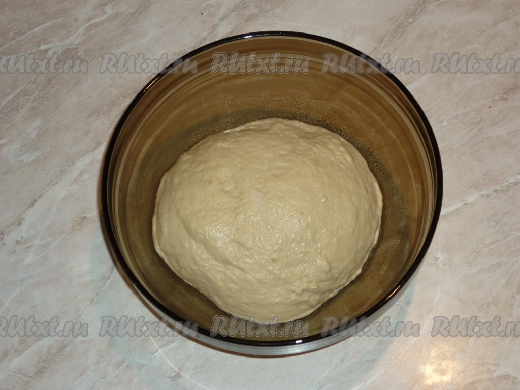 Миску смазать растительным маслом и выложить тесто. Накрыть кухонным полотенцем и поставить в тёплое место, без сквозняков, на 1,5-2 часа, оно должно увеличиться в объеме в несколько раз. За это время нужно обмять тесто два раза.