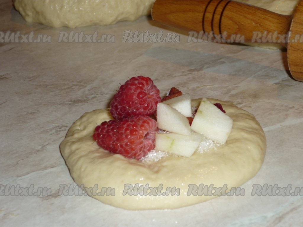Каждую часть теста раскатать в лепёшку, в центр которой выложить фруктовую начинку и посыпать 0,5-1 чайной ложкой сахара (количество сахара регулируйте, в зависимости от сладости фруктов).