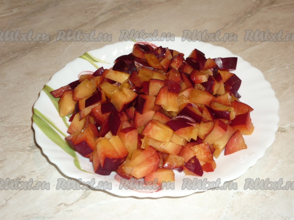 Из слив удалить косточки и нарезать небольшими кубиками.
