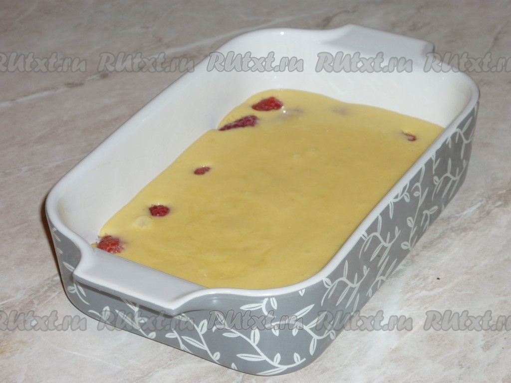 Залить ягоды (или фрукты) тестом. Тесто не должно заполнять форму больше, чем на половину, так как при выпечке клафути очень хорошо поднимется.