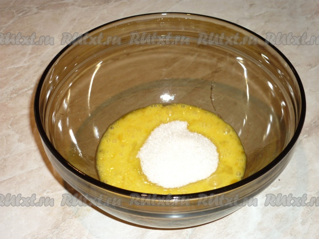 Всыпать сахар (при желании, можно добавить и ванильный сахар) и ещё раз хорошо размешать венчиком (или с помощью вилки).