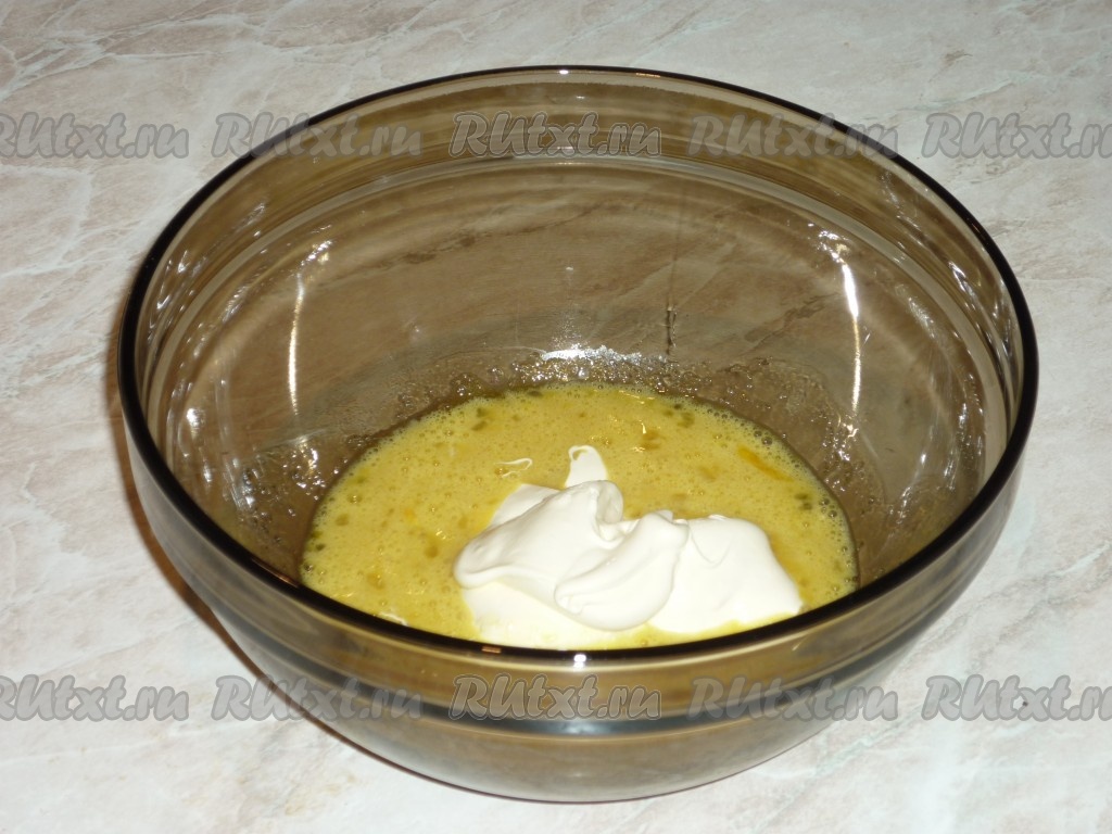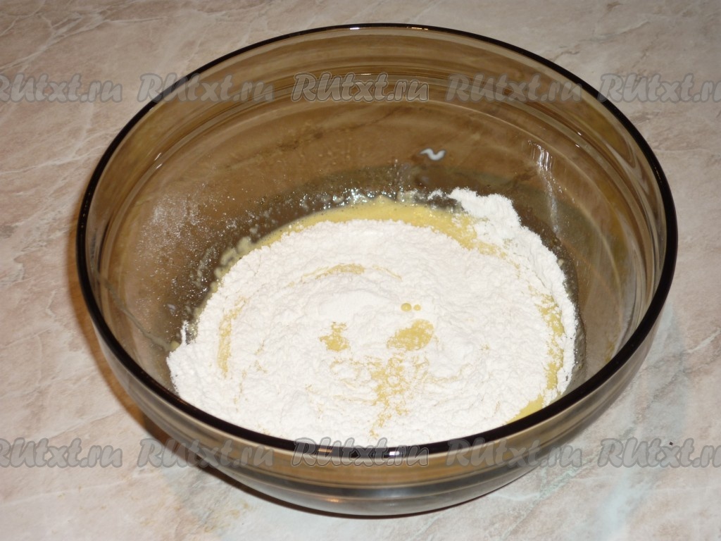Всыпать частями просеянную муку с разрыхлителем, хорошо перемешать, чтобы тесто было однородным, без комочков.