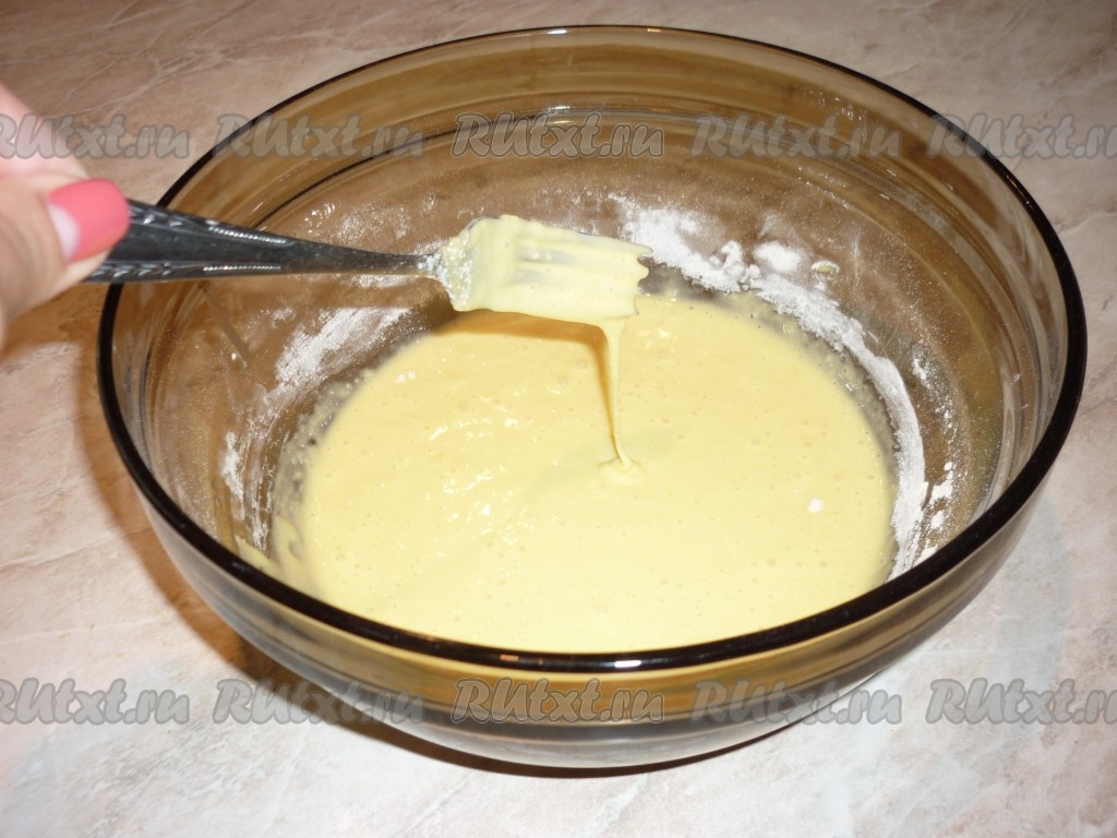 Тесто должно получиться чуть гуще, чем на блины, как на фото.