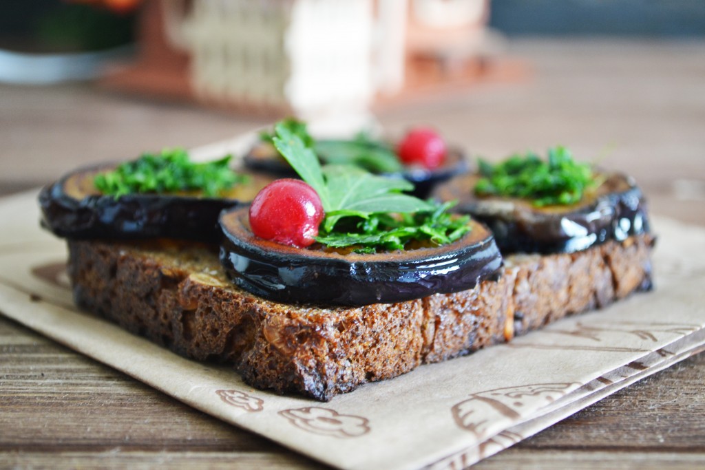 Для украшения можно выложить ягоды смородины, но это уже дело вкуса. Очень вкусная брускетта с баклажанами готова.