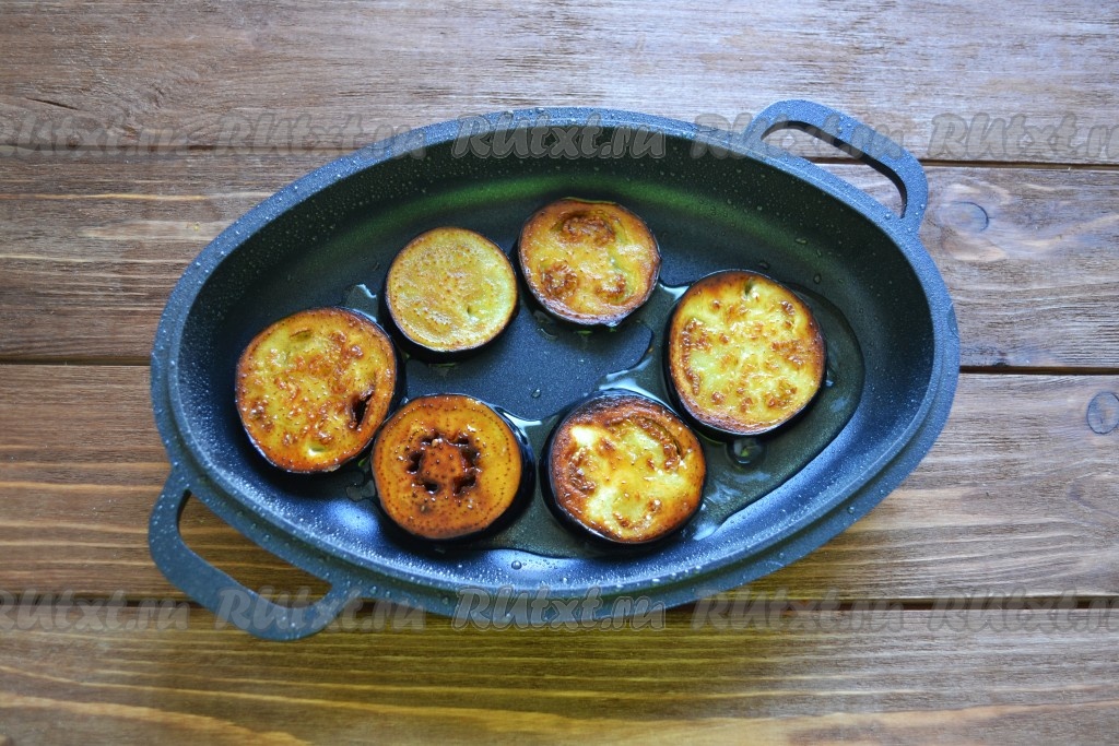 На разогретую сковороду вливаем масло и через 1 минуту выкладываем подготовленные кружочки баклажанов, обжариваем с каждой стороны по 1 минуте, до красивого поджаренного цвета.