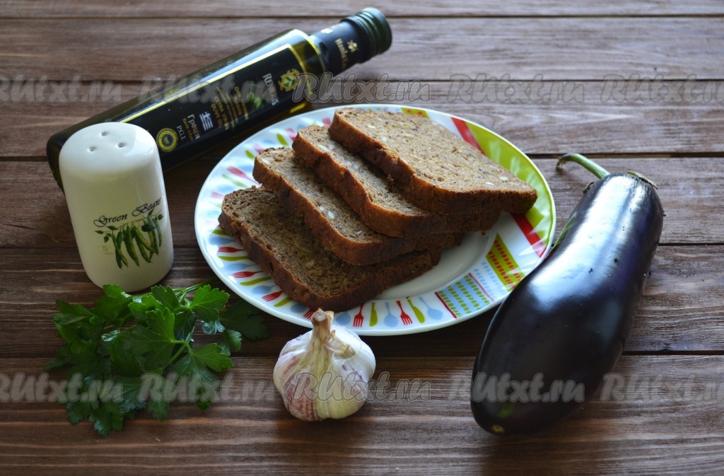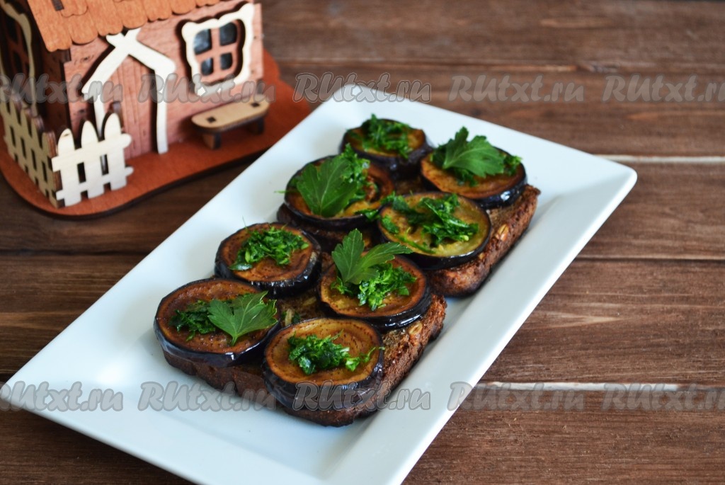 На ломтики хлеба выкладываем баклажаны, сверху - перемолотую чесночную зелень.