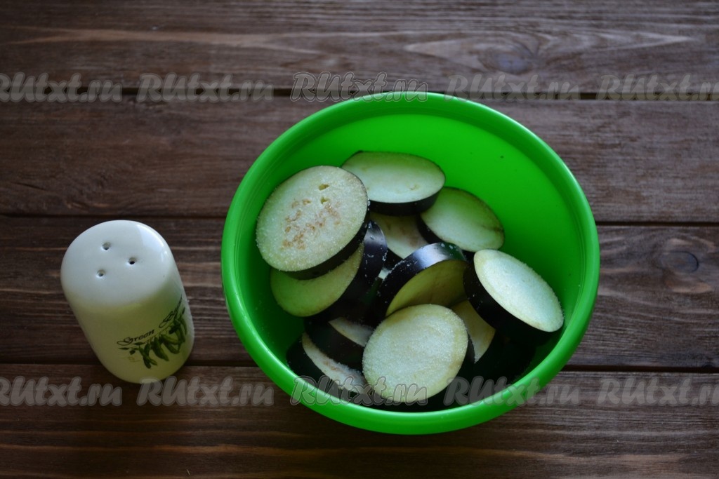 Баклажан моем, нарезаем кружочками (толщиной примерно 5 мм), посыпаем солью и оставляем на 30 минут. Затем необходимо стряхнуть нерастаявшую соль с баклажанов, а образовавшуюся жидкость слить.