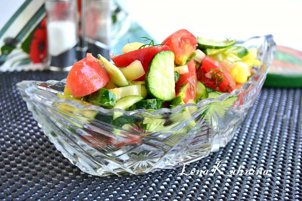 Вкусный, ароматный и свежий салат из помидоров, перца и огурцов выложить в салатник и сразу же подать к столу!