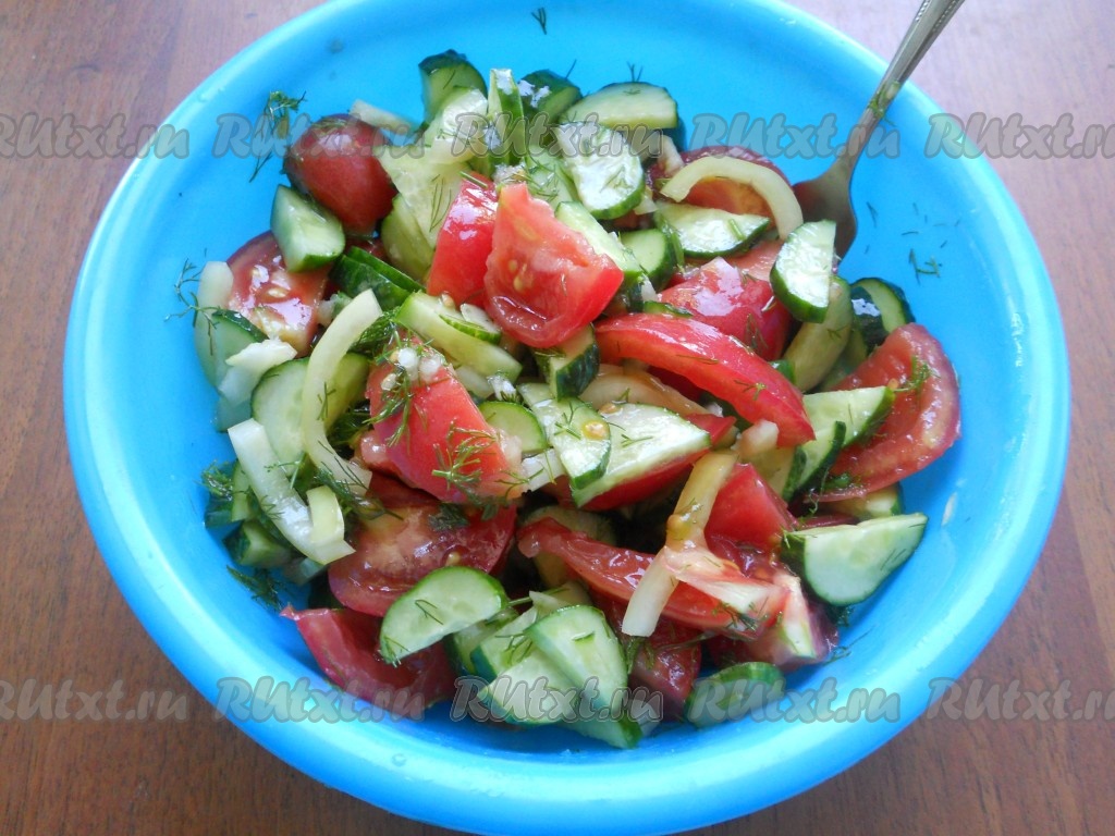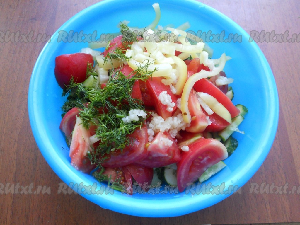 Салат из помидоров, перца и огурцов - простое, но очень вкусное летнее блюдо, которое можно быстро приготовить к обеду или ужину. Отлично подойдет к шашлыку! Благодаря нерафинированному ароматному подсолнечному маслу, свежим овощам и чесноку, салат получается необычайно ароматным. Попробуйте, вам обязательно понравится!