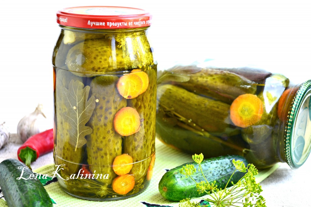 Маринованные огурцы с морковью - отличная заготовка на зиму! Огурчики для этой консервации лучше использовать маленькие и закрывать их в литровых банках. Огурцы с морковью по этому рецепту получаются хрустящими и очень вкусными. Расчет продуктов дан на две литровые баночки.