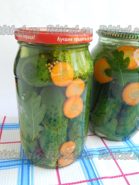 После того как воду слили, залить огурцы кипящим маринадом. Накрыть банки крышками и простерилизовать 10 минут. Для стерилизации: в большую кастрюлю налить воду, на дно кастрюли поместить полотенце или кусок марли, сложенный вдвое-втрое. Поставить кастрюлю на огонь. Когда вода начнет закипать, аккуратно поставить в воду банки с огурцами. Как только вода снова закипит, огонь уменьшить, стерилизовать огурцы 10 минут. Банки закатать или закрутить, перевернуть и укутать одеялом. Оставить в таком виде до полного остывания. Хранить огурцы можно при комнатной температуре. Перед употреблением необычайно вкусные и хрустящие маринованные огурцы с морковью лучше охладить.