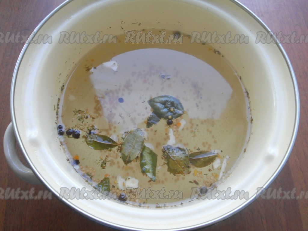 Для приготовления маринада воду довести до кипения, всыпать соль, сахар, добавить приправу для маринования огурцов. Состав приправы: семена горчицы и укропа, овощи сушеные, чеснок пластинами, перец черный и душистый горошком, лавровый лист, базилик, семена тмина, кориандр. Далее влить в маринад уксус, дать закипеть.